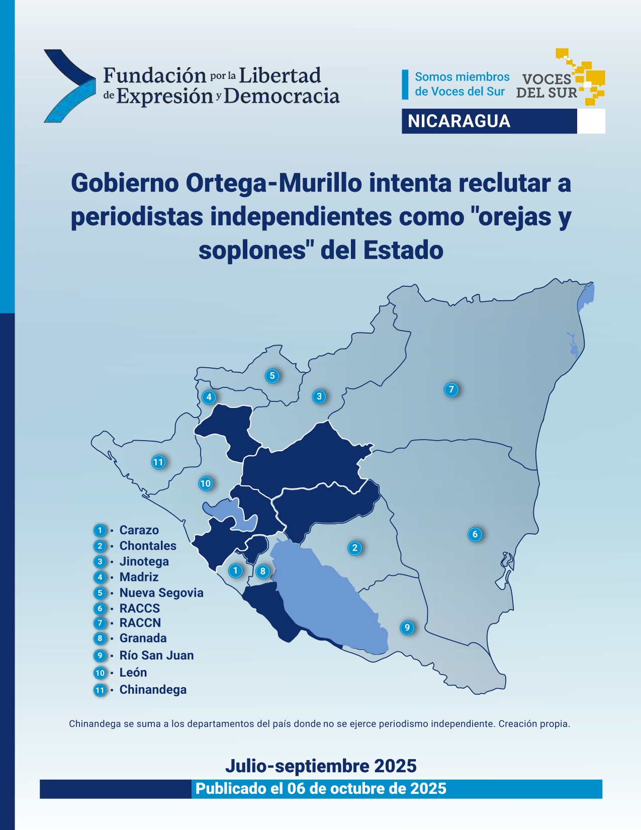 La Fundación por la Libertad de Expresión y Democracia (FLED) advierte en su III Informe Trimestral 2025 que once departamentos del país carecen de medios independientes, lo que equivale al 65 % del territorio nacional convertido en “desiertos informativos”. Para FLED, esto refleja un “desmantelamiento sistemático” que combina asedio, intimidación, confiscaciones, encarcelamientos y exilio forzado, hasta silenciar casi por completo la información independiente.